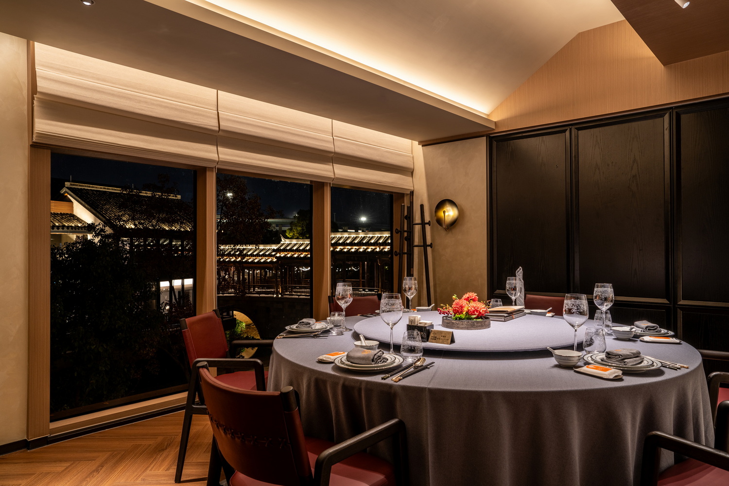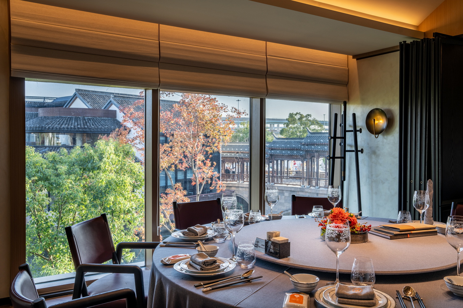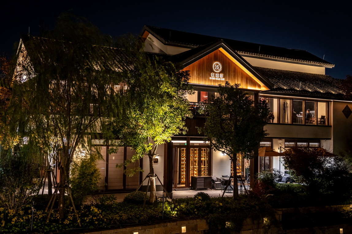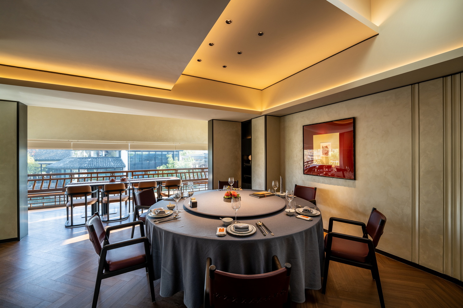 当夕阳余晖洒落,金辉斑驳地点缀在雅致的走廊与散台之上,随时间缓缓推进,光影交织。