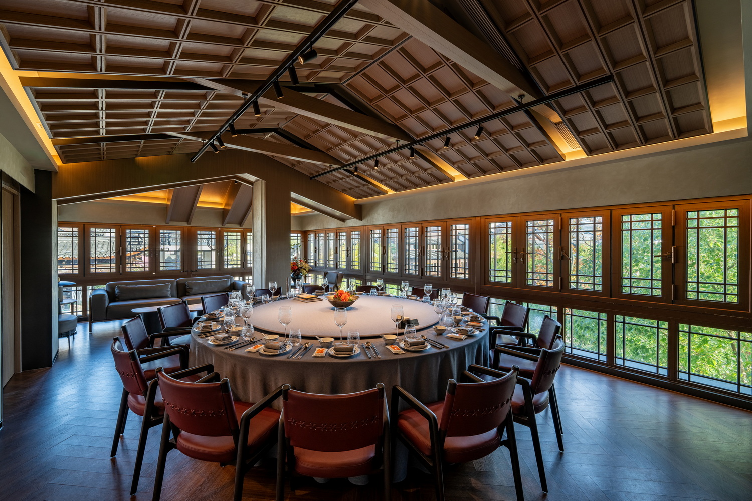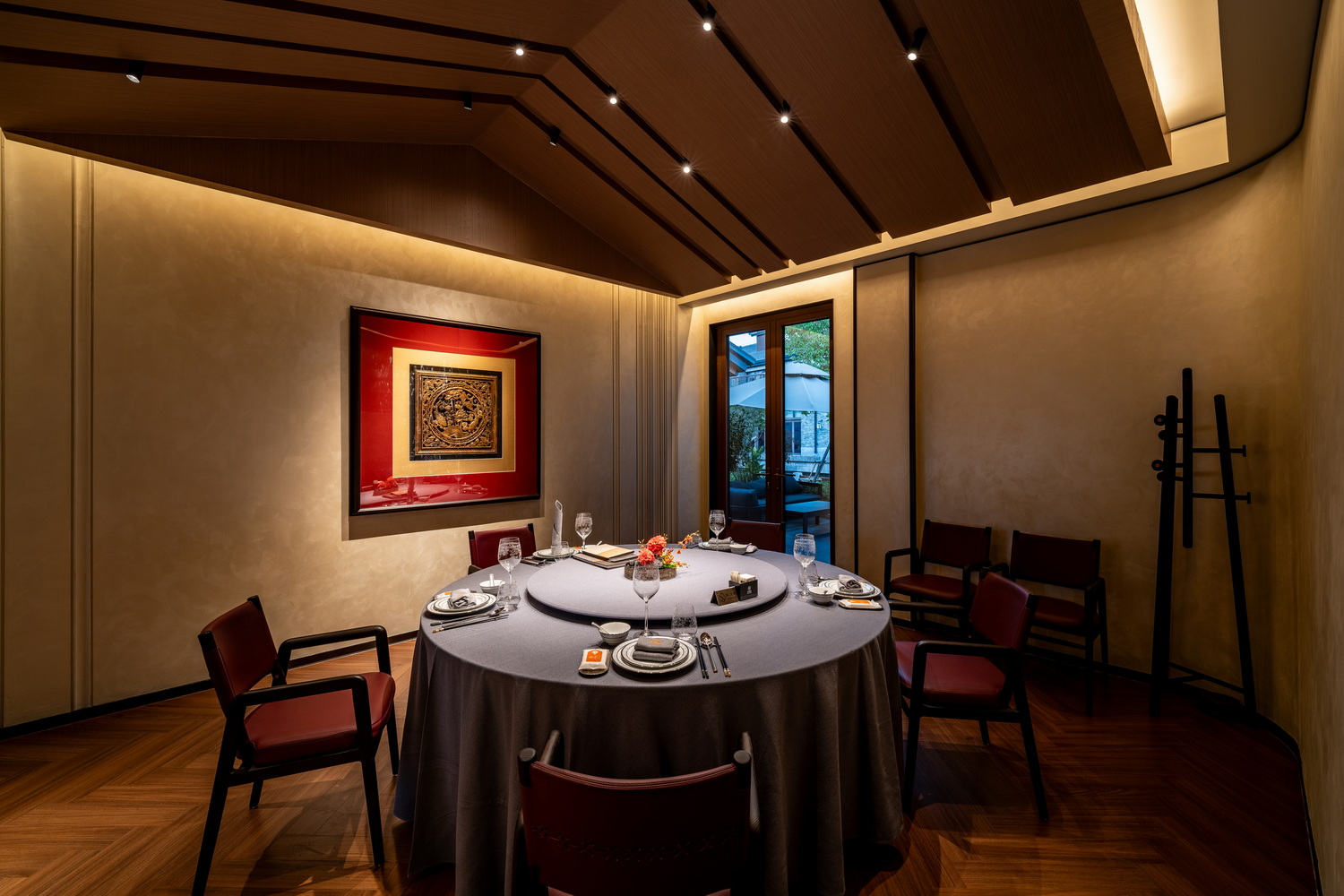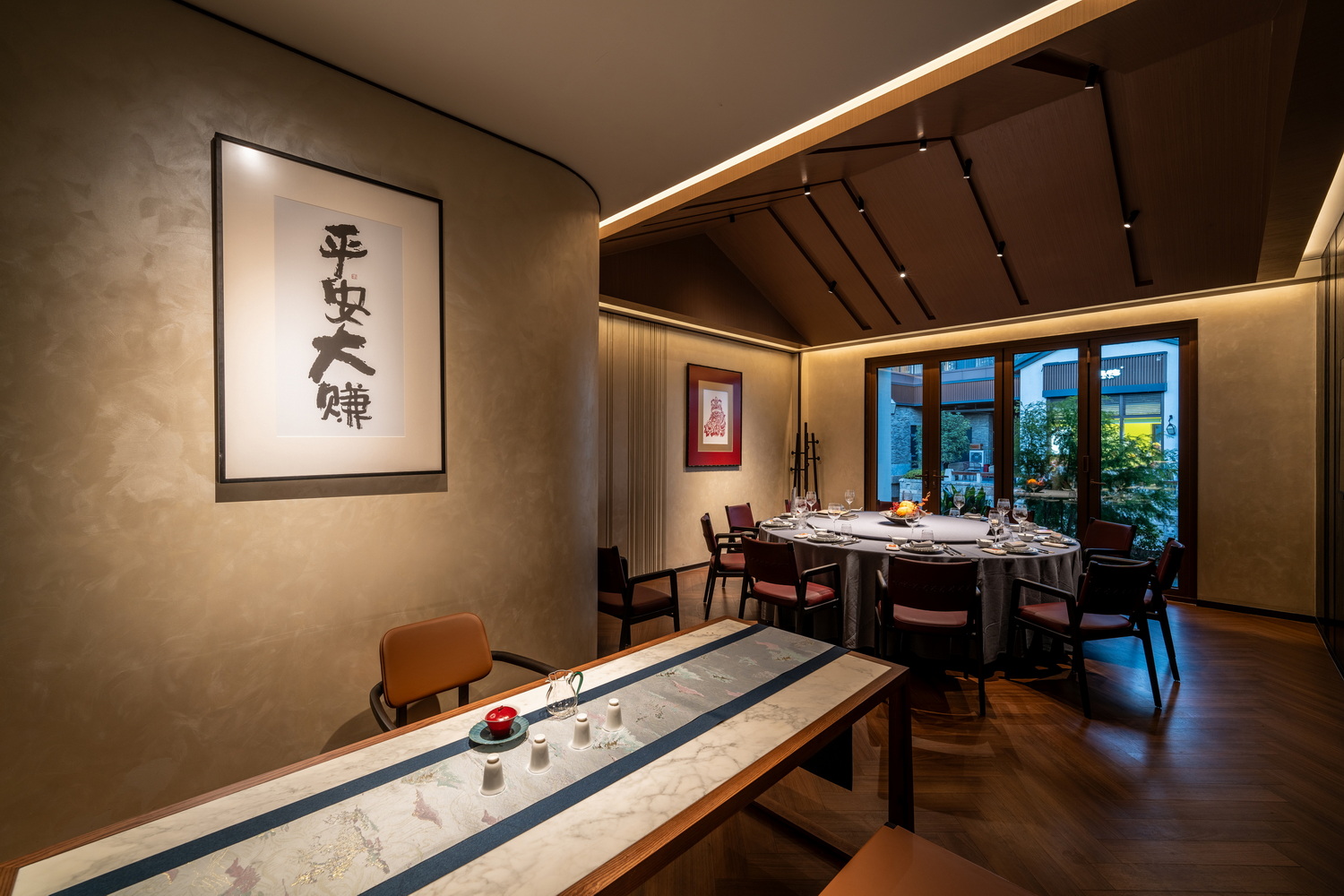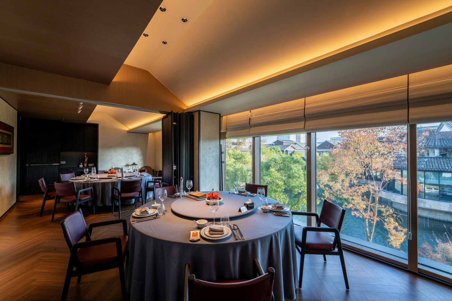 当夕阳余晖洒落,金辉斑驳地点缀在雅致的走廊与散台之上,随时间缓缓推进,光影交织。