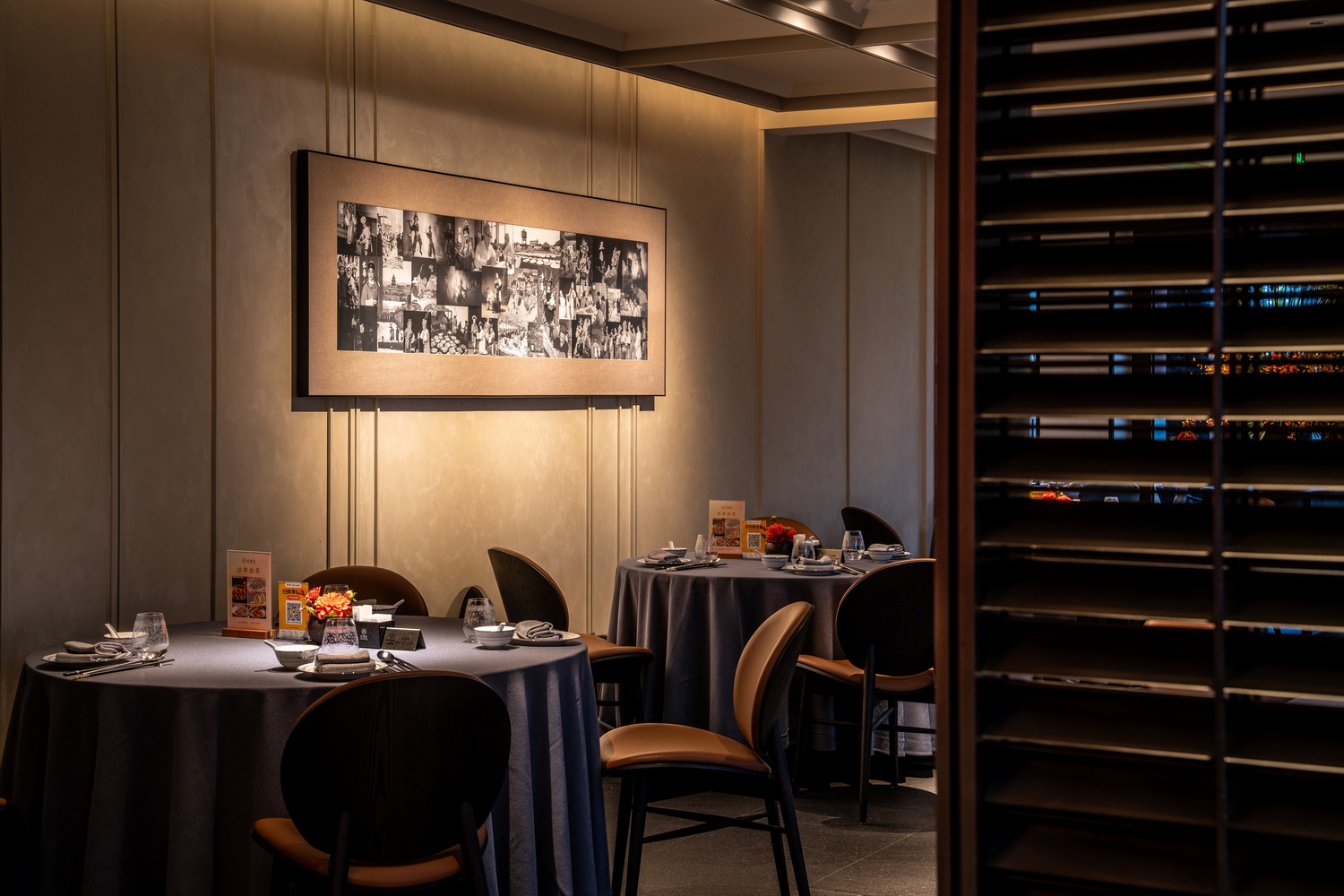 行走间,不经意的一瞥便可看见仿百叶窗式的屏风隔断,木质的纹理质感温润。
