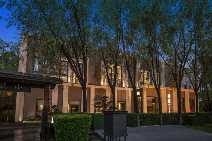 古典园林与现代简约的风格,仿佛两者间跨时代的呢喃细语。月光透过层叠的树叶倾洒而下,在建筑、