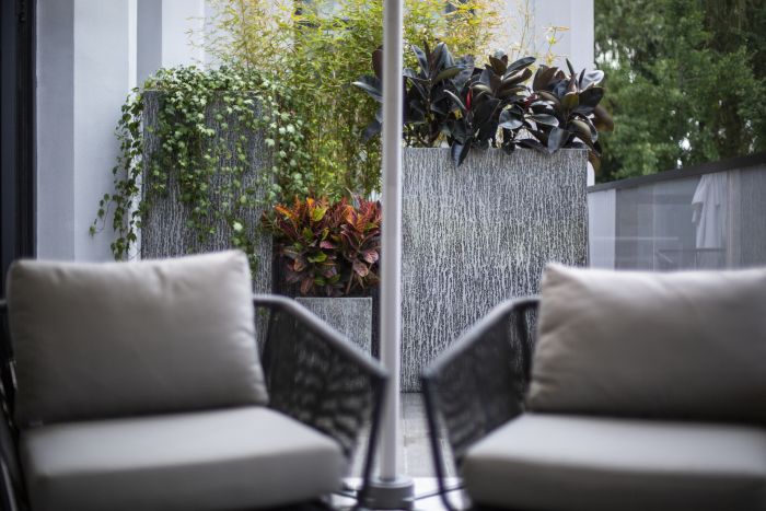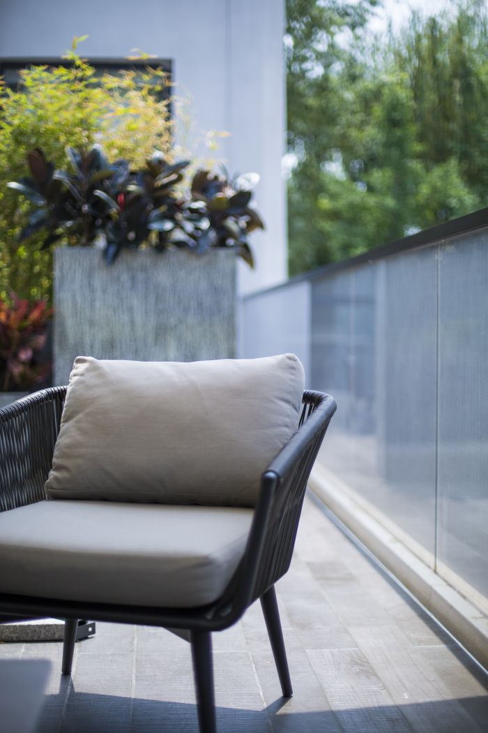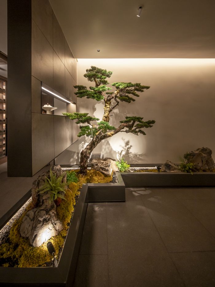 当穿过充满艺术韵味的入户大门后,独特的造景映入眼帘。围墙而造的观景池,视觉中心定为正中的