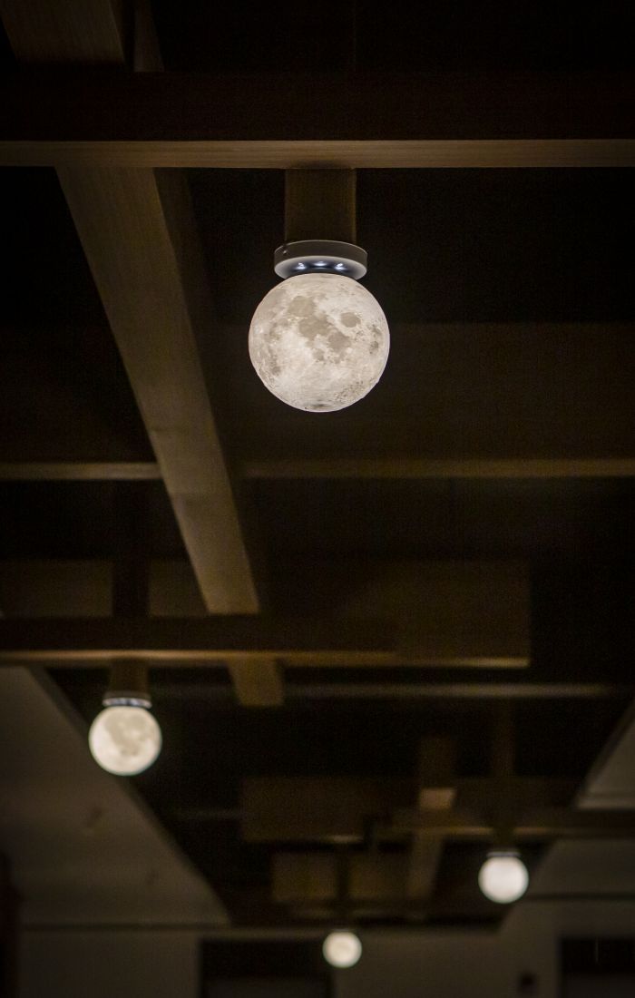 进入散台空间不经意间的抬头,便可看见错落有致的木质梁架结构静静的悬于天花之上,月球造型的